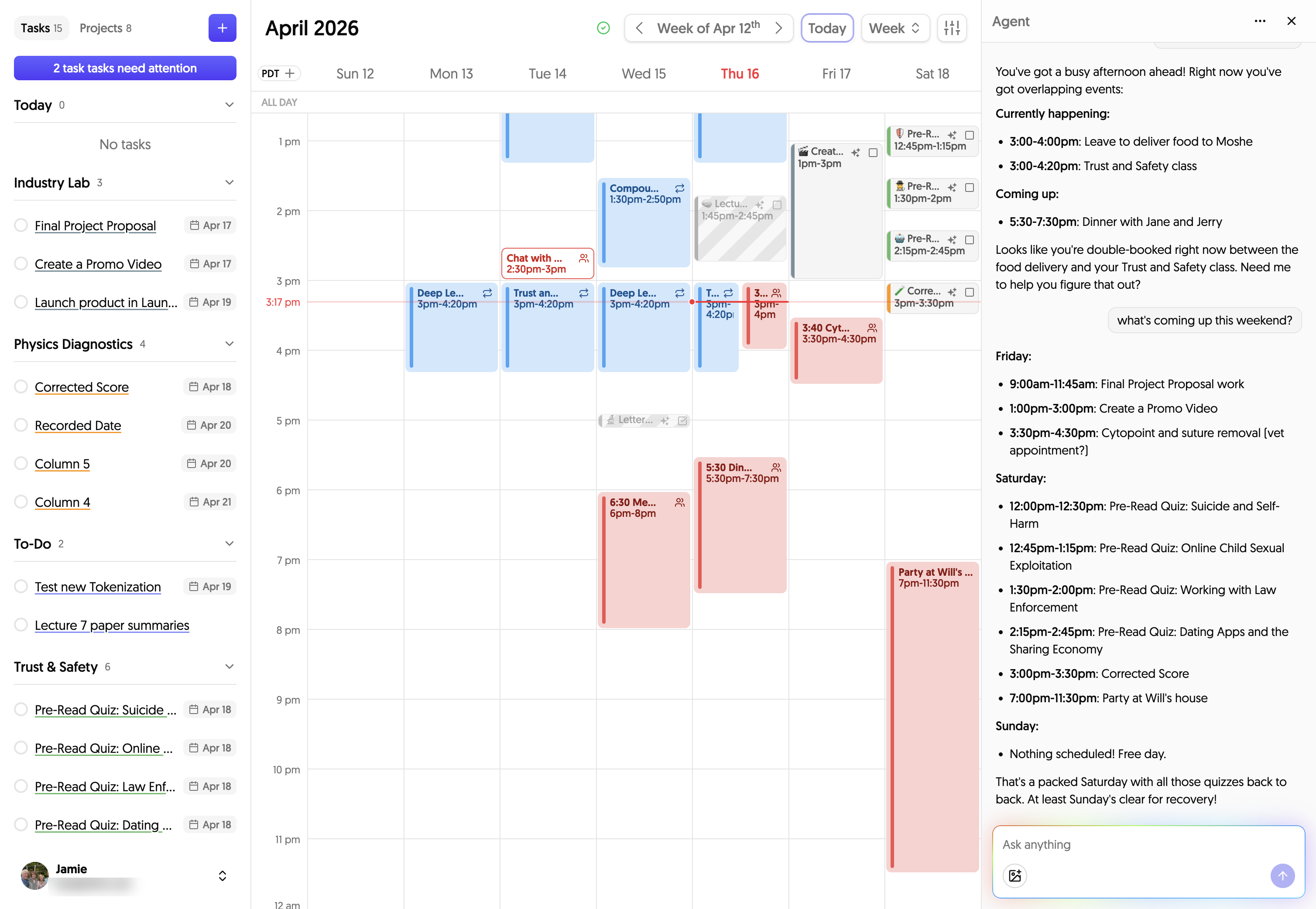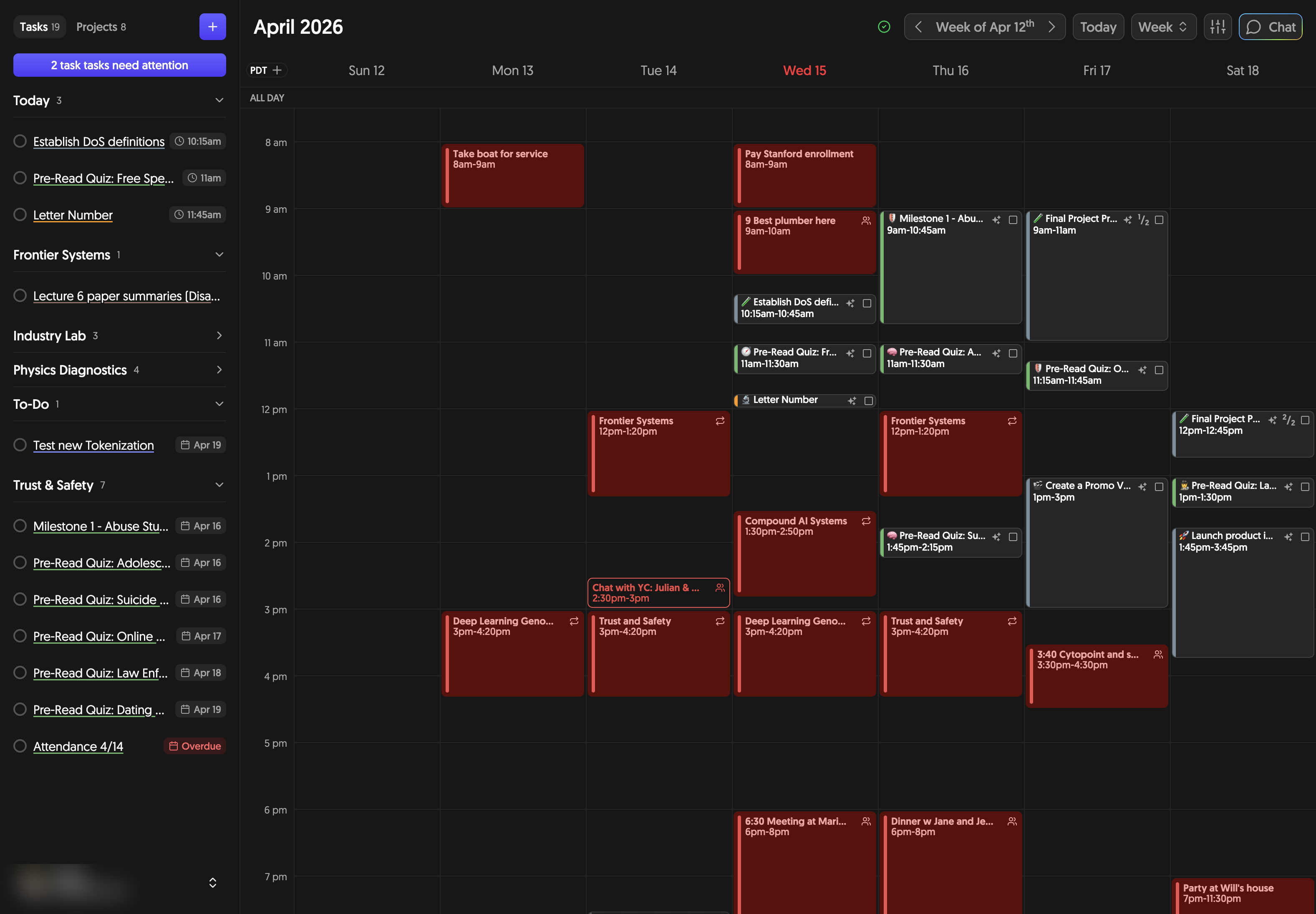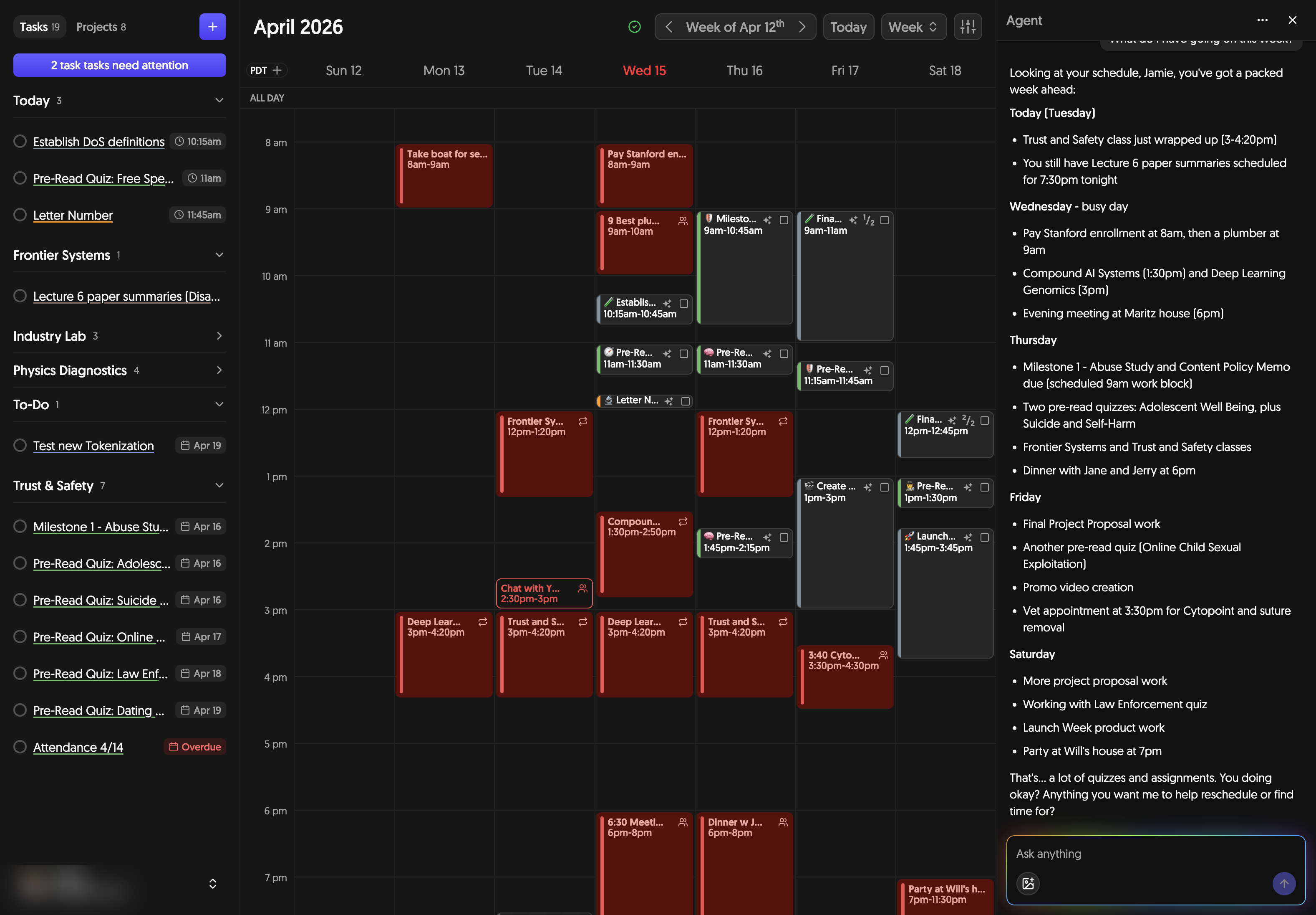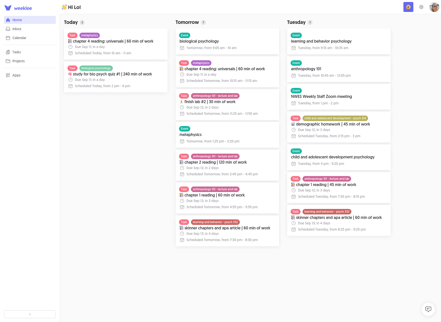 weeklee.ai helps me navigate the rigid deadlines and schedules of the school week, reminding me of tasks that I might have missed and finding the best times for me to do them without sacrificing my free time.